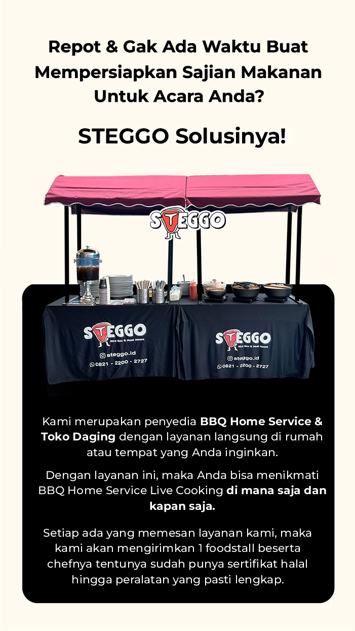 STEGGO BBQ HOME SERVICE CATERING & MEAT SHOP | Harga mulai dari 1.9jt/20pax* | Bikin Acara Semakin Mudah & Praktis | BBQ Steak Home Service Live Cooking! | Birthday Party, Catering, Wedding Party, Arisan, Kumpul Keluarga, Teman Kantor, Gathering Kantor, Outing, BBQ Catering Puncak | Outlet Pusat : Jl. Panglima Polim No.31C, Melawai, Kota Jakarta Selatan | PT TIEGA WANGSA SEJAHTERA